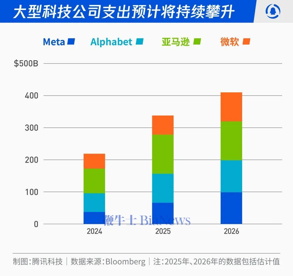 根据相关业绩数据,Meta、Alphabet、Amazon、Microsoft四家公司整个2025年AI资本支出合计接近3000亿美元,且2026年将继续保持增长趋势,预计将超过4000亿美元。