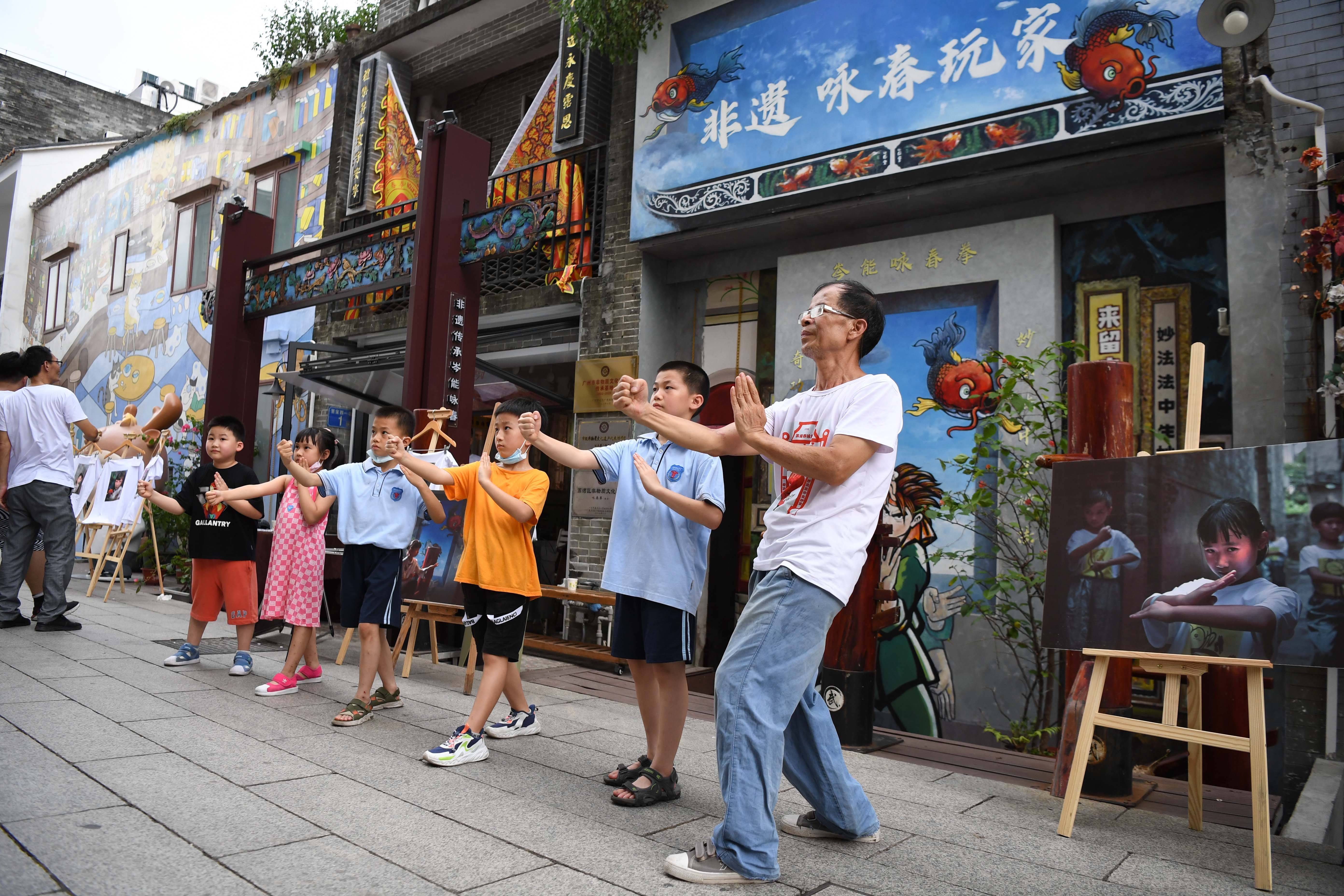 孩子们在广州永庆坊体验咏春拳(2022年7月18日摄)。