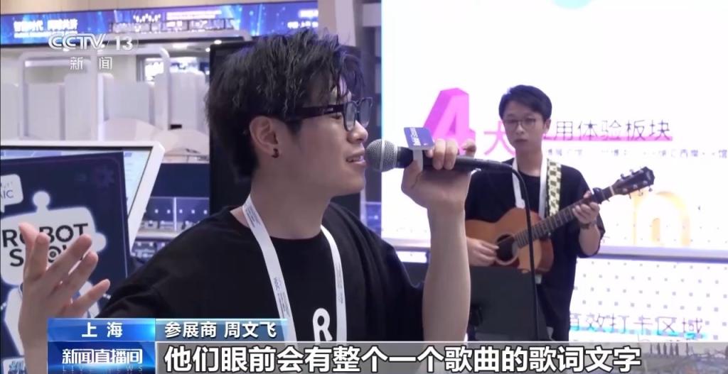 参展商 周文飞:用的提词器功能,我们把所有的歌词植入到眼镜里面。所有的歌手,包括现场合唱的嘉宾,他们眼前会有歌曲的歌词文字。
